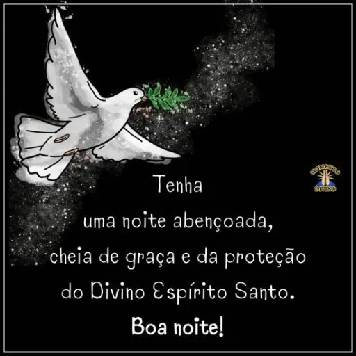 Uma pomba branca voando com um ramo de oliveira na boca, em meio a uma nuvem de poeira ou fumaça, com o texto 'Tenha uma noite abençoada, cheia de graça e da proteção do Divino Espírito Santo. Boa noite!'