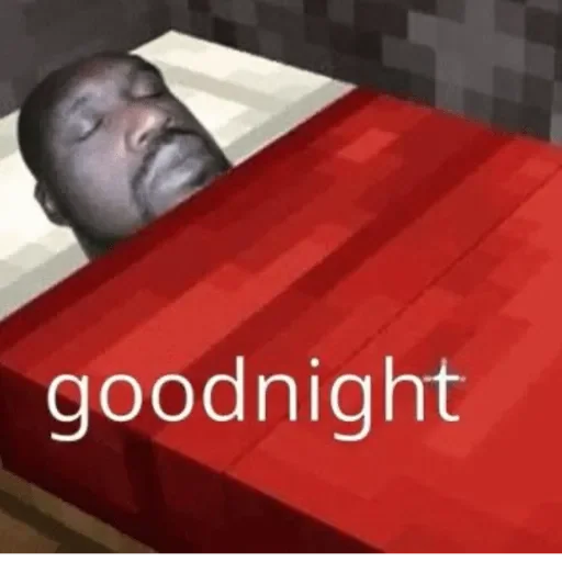 Um homem negro deitado na cama com os olhos fechados, coberto por um cobertor vermelho. A palavra 'goodnight' aparece em branco.