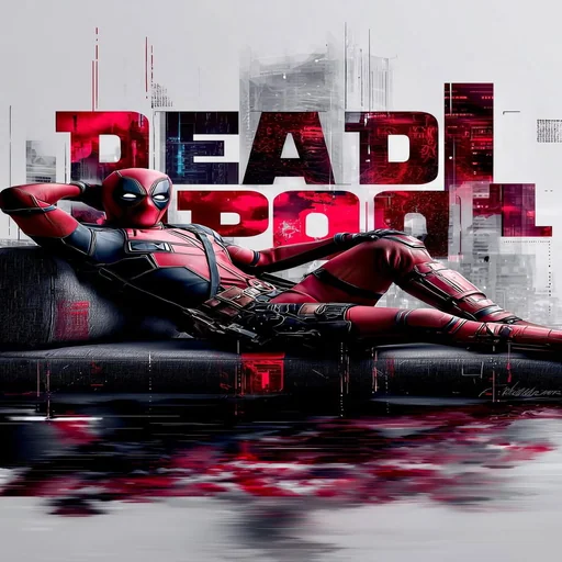 Deadpool deitado em uma superfície preta com a cidade ao fundo, letras grandes vermelhas e pretas ao fundo 'DEADPOOL'