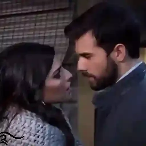 Cena de um homem e uma mulher prestes a se beijar, ambos com expressões emocionais, ele de blazer e camisa branca, ela de cabelo escuro e suéter claro.