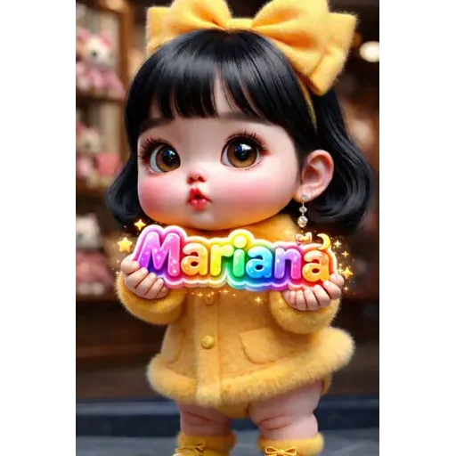 Menina de cabelo preto com franja e um laço amarelo na cabeça, vestindo um conjunto amarelo, segura uma placa com o nome 'Mariana' em letras coloridas.