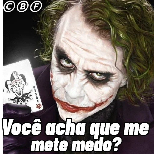 O Coringa, caracterizado por seu sorriso vermelho e maquiagem branca, olha com um olhar sinistro enquanto segura um cartão. Abaixo dele, está escrito 'Você acha que me mete medo?'