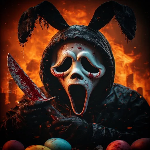 Máscara de terror com orelhas de coelho, segurando uma faca ensangüentada em frente a um fundo de chamas, com ovos coloridos na parte inferior.