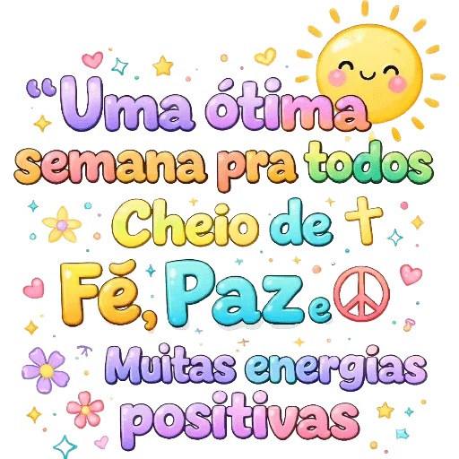 Um sol amarelo com sorriso e olhos fechados, rodeado de texto colorido que diz 'Uma ótima semana pra todos Cheio de Fé, Paz. Muitas energias positivas' e símbolos como estrelas, corações e um símbolo de paz.
