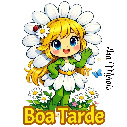 Uma menina de cabelos loiros com uma flor na cabeça e um vestido de flor, com o texto 'Boa Tarde' embaixo. Ela tem um sorriso no rosto e uma mão levantada.