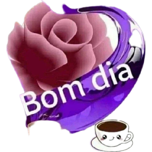 Uma rosa roxa em forma de coração com o texto 'Bom dia' sobreposta, acompanhada de uma xícara de café com sorriso.