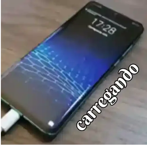 Um celular preto com a tela azul e o horário 17:28 sendo carregado com um cabo branco, com o texto "carregando" sobreposto.