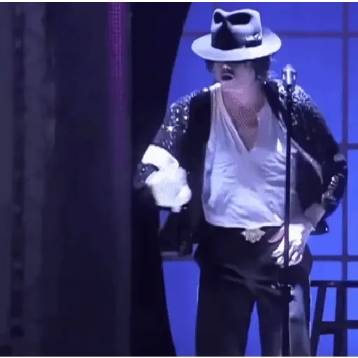 Homem com jaqueta prateada e azul, calça preta e chapéu, em uma pose de dança.