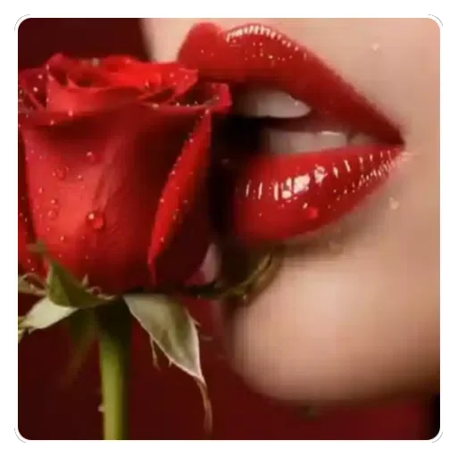 Lábios pintados de vermelho com brilho, beijando uma rosa vermelha com gotículas de água. O fundo é escuro e desfocado.