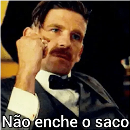 Homem de terno e gravata, com a mão no rosto, parecendo irritado. Abaixo dele, está escrito 'Não enche o saco'.