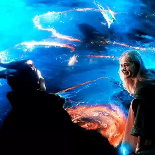 Uma cena dramática com duas pessoas em silhueta contra um fundo azul vibrante com nuvens e uma grande explosão de fogo laranja. A mulher à direita tem cabelo loiro e parece surpresa.