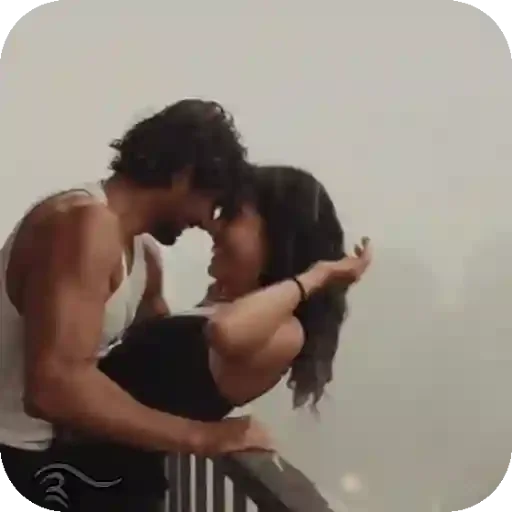 Um casal se beijando, o homem de camisa branca e calça preta, a mulher de vestido preto, com a mão no cabelo.