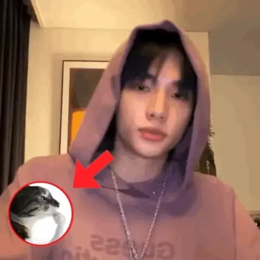Um jovem com um capuz rosa e uma corrente de prata ao redor do pescoço, com uma seta vermelha apontando para um círculo com um gato preto e branco.