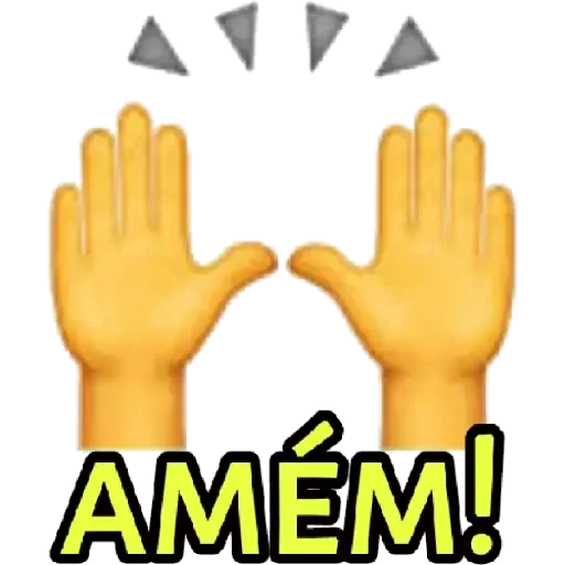 Mãos amarelas com palmas para cima e a palavra 'AMÉM!' em letras amarelas com contorno preto. Três triângulos cinzas apontando para as mãos.