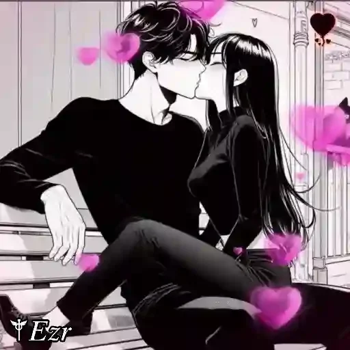 Um casal se beijando, com o homem de preto e a mulher de preto com cabelos longos. Há corações rosa ao redor deles.