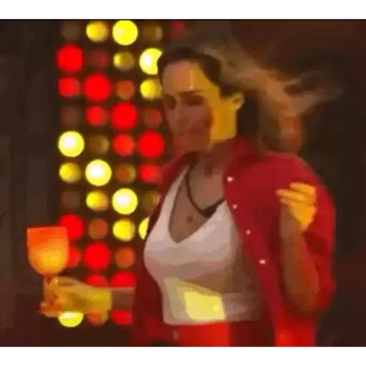 Mulher com cabelo castanho e um brinco, vestindo uma blusa vermelha e uma camiseta branca, com uma taça de vinho na mão, em frente a uma parede de luzes coloridas.