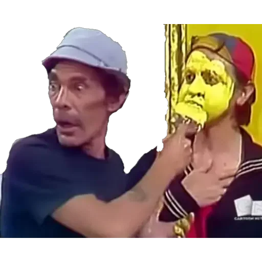 Um homem de boné azul puxa a máscara amarela de um adolescente que usa um moletom preto com listras brancas e um boné vermelho.