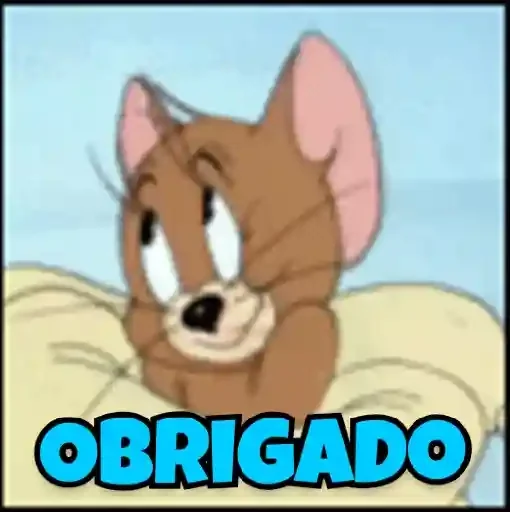 Um desenho do Tom, o gato da série de desenhos animados Tom e Jerry, com expressão facial relaxada e a palavra 'OBRIGADO' em letras azuis na parte inferior.