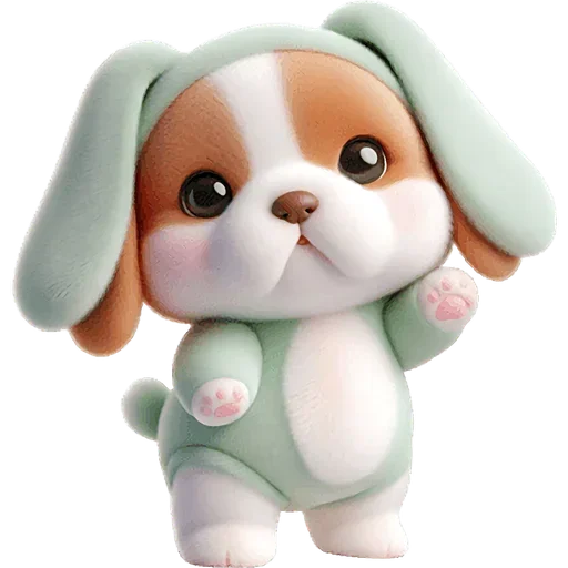 Um cachorrinho fofinho vestido com um pijama de coelho verde claro, com orelhas grandes e olhos pretos grandes.