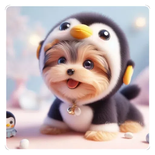 Um cachorrinho fofo vestindo uma fantasia de pinguim, com uma pequena medalha no pescoço, em um fundo azul claro com neve.