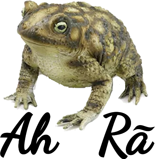 Um sapo verde-oliva com manchas mais escuras, expressão neutra, com as palavras 'Ah Rã' embaixo.