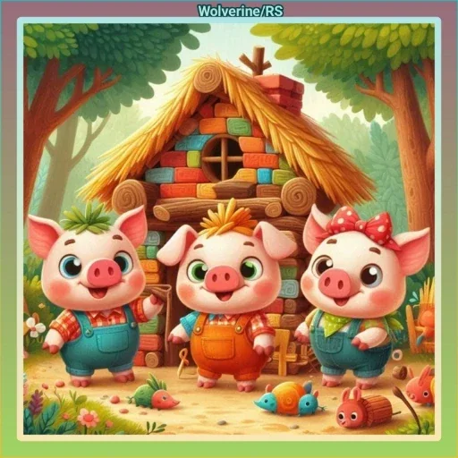 Três porcos coloridos vestidos com roupas de jardim estão em frente a uma pequena casa de madeira com telhado de palha em uma floresta. Eles parecem felizes e animados.