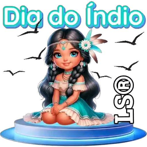 Uma menina indígena sentada em uma plataforma azul, com um colar e uma flor na cabeça, cercada por pássaros. A imagem traz o texto 'Dia do Índio'.
