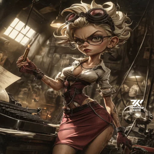 Uma mulher com cabelos loiros e óculos de proteção aparece em uma oficina, vestindo um macacão vermelho e uma camisa cinza. Ela segura uma ferramenta na mão.