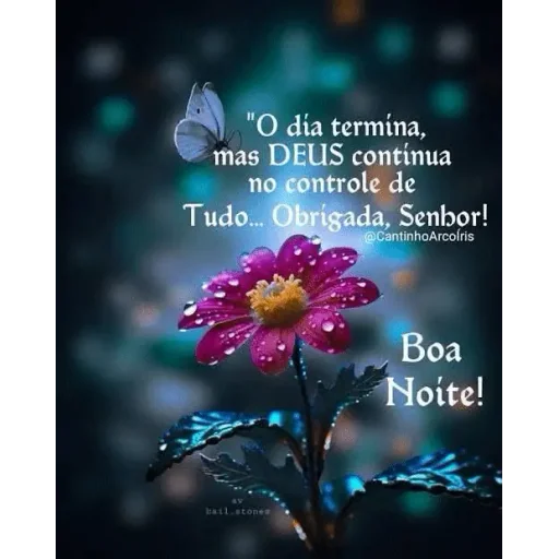 Uma flor rosa com um centro amarelo e folhas verdes, acompanhada de uma borboleta cinza e a frase 'O dia termina, mas DEUS continua no controle de Tudo. Obrigada, Senhor!' e 'Boa Noite!' em fundo escuro com luzes.