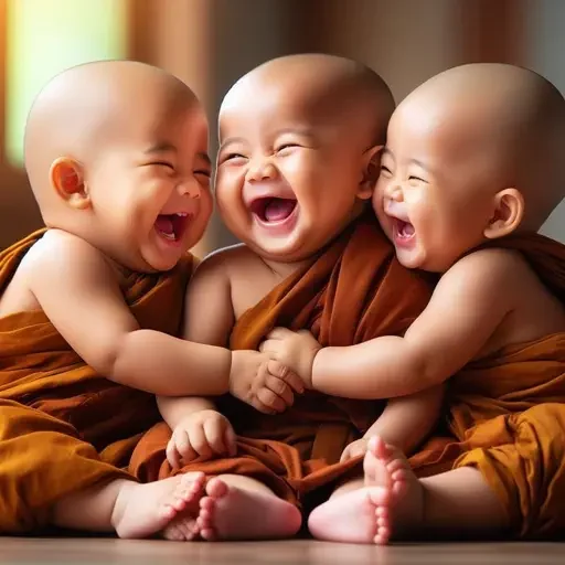 Três bebês vestidos com roupas de monge, sentados e rindo juntos. Eles têm expressões alegres e estão segurando as mãos uns dos outros.