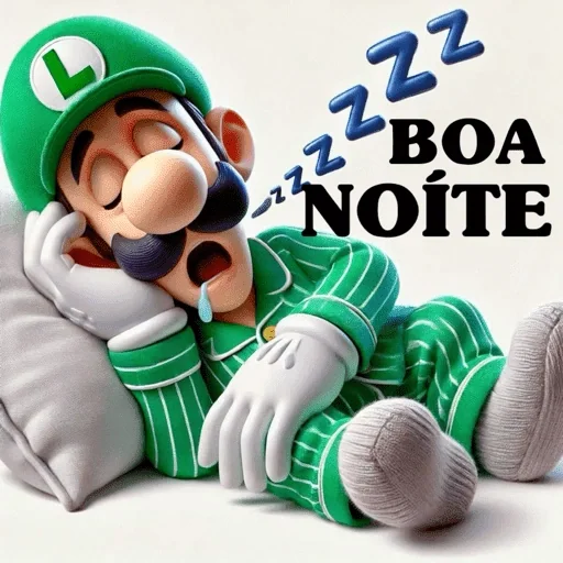 Luigi, do jogo Mario, está deitado e dormindo com um travesseiro, usando um pijama verde listrado. Ele tem um bigode preto e um 'L' no chapéu. Há um 'zzz' saindo de sua boca e o texto 'BOA NOÍTE' ao lado.