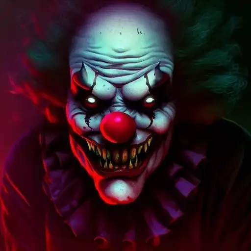 Um palhaço assustador com maquiagem branca e um nariz vermelho, olhos brilhantes e dentes afiados, em um fundo escuro e sombrio.