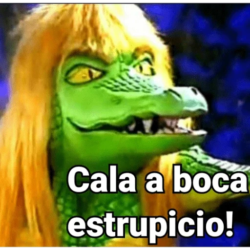 Um crocodilo verde com cabelo loiro e uma expressão facial zangada, com a frase 'Cala a boca estrupicio!' sobreposta.