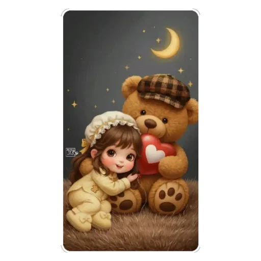 Um ursinho de pelúcia marrom e uma menina fofa sentados embaixo de uma lua crescente à noite. O ursinho usa um chapéu xadrez e segura um coração vermelho com um coração branco no centro.
