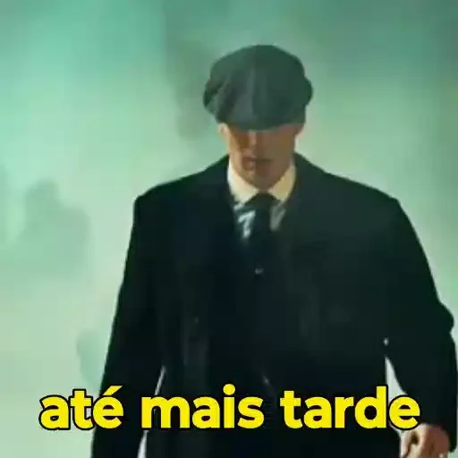 Um homem de terno preto e chapéu, com o texto 'até mais tarde' em amarelo na parte inferior.