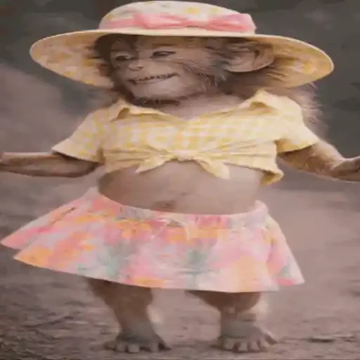 Um macaco vestido com uma camisa amarela e uma saia rosa e laranja, usando um chapéu de palha. A imagem tem um efeito de envelhecimento.