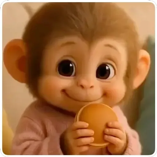 Um macaco de olhos grandes e sorriso leve, com cabelo castanho, segurando um pão redondo.