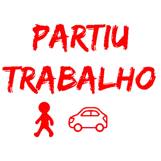 Um sticker com o texto 'PARTIU TRABALHO' em vermelho, acompanhado de um ícone de uma pessoa e um carro.