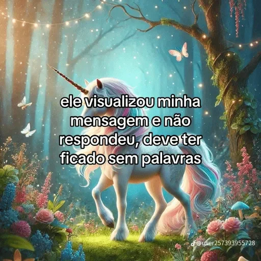 Um unicórnio em um bosque mágico com flores coloridas e borboletas, com o texto "ele visualizou minha mensagem e não respondeu, deve ter ficado sem palavras" sobreposto.