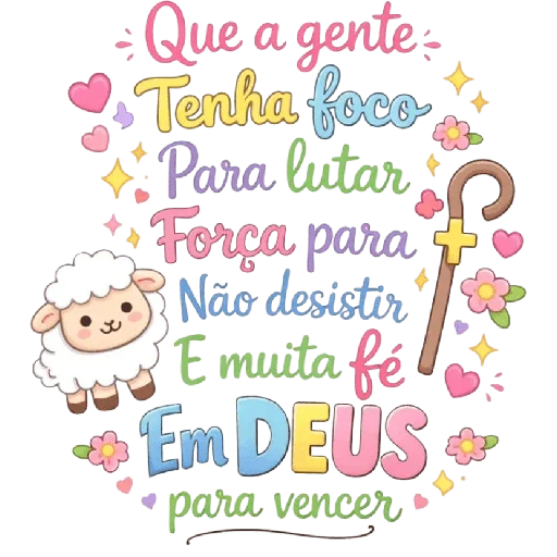 Um cordeiro branco ao lado de um cajado com uma cruz dourada, rodeado de texto colorido que diz 'Que a gente tenha foco para lutar, força para não desistir e muita fé em DEUS para vencer', com corações, estrelas e flores.
