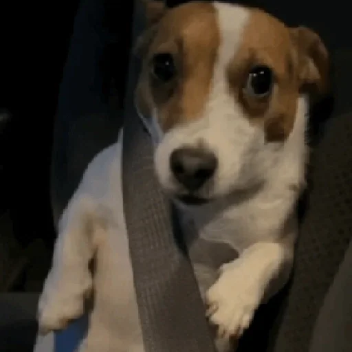 Cachorro com olhos arregalados e expressão surpresa, sentado em frente a um sofá laranja.