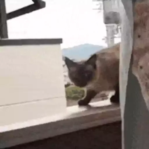 Gato siamês marrom claro com manchas escuras no focinho e patas, olhando para a esquerda em uma janela com vista para o exterior.
