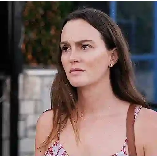 Mulher com cabelos castanhos e olhos azuis, parecendo surpresa ou preocupada, contra um fundo verde.