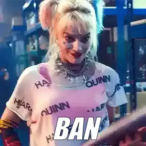 Uma mulher loira com um penteado peculiar e maquiagem pesada, vestindo uma camiseta branca com o nome 'HARLEY QUINN' impresso várias vezes. Ela está com uma expressão facial séria e a palavra 'BAN' aparece em destaque na frente dela.