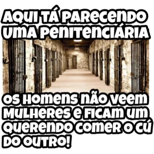 Imagem de um corredor de cela de prisão com texto em branco e preto que diz 'AQUI TÁ PARECENDO UMA PENITENCIÁRIA OS HOMENS NÃO VEEM MULHERES E FICAM UM QUERENDO COMER O CÚ DO OUTRO!'