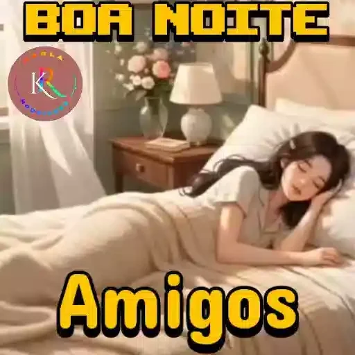 Uma mulher deitada na cama com a mão na cabeça, usando uma camiseta branca e coberta com um lençol bege. Há uma mesa de cabeceira com uma lâmpada e flores ao fundo. A imagem traz o texto 'BOA NOITE Amigos' em letras amarelas.