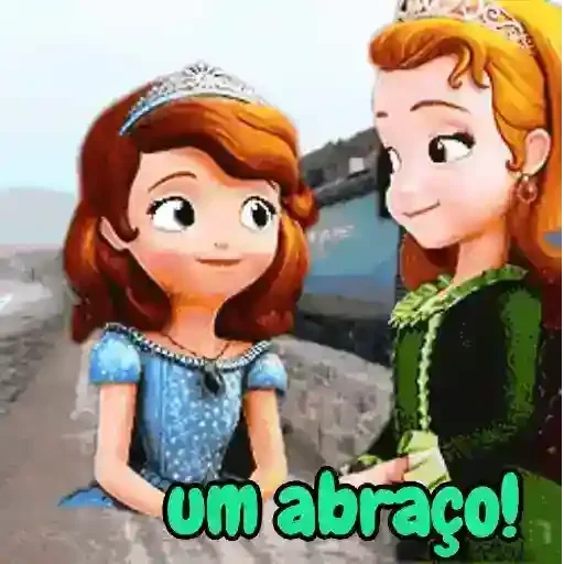 Duas princesas de um desenho animado, uma de cabelo castanho e vestido azul, e a outra de cabelo ruivo e vestido verde, com a frase 'um abraço!' em verde na parte inferior.