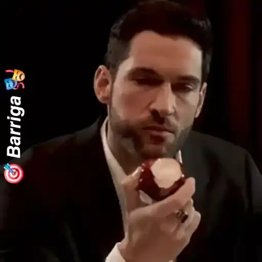 Um homem de cabelo preto e barba curta, vestido com um blazer preto e camisa branca, segura um objeto vermelho na mão e olha para ele com uma expressão séria. A imagem contém o texto 'Barriga' e um logo colorido.