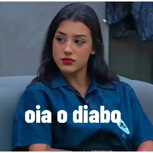 Uma mulher com cabelo preto e camisa azul olhando para o lado com uma expressão surpresa ou confusa, com o texto "oia o diabo" sobreposto.