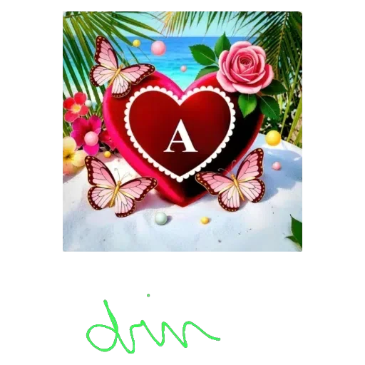 Coração vermelho com a letra 'A' no centro, decorado com borboletas e uma rosa, em um cenário tropical com palmeiras e frutas.